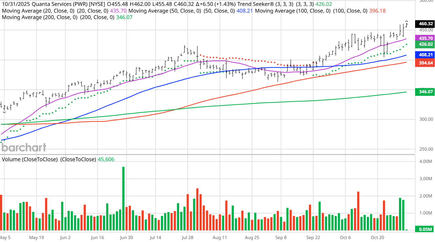 • Quanta Services (PWR) is trading at new all-time highs with strong technical momentum.