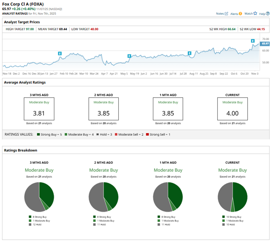 On Oct. 31, Wells Fargo analyst Steven Cahall raised Fox Corp.’s price target to $80 and maintained an “Overweight” rating.