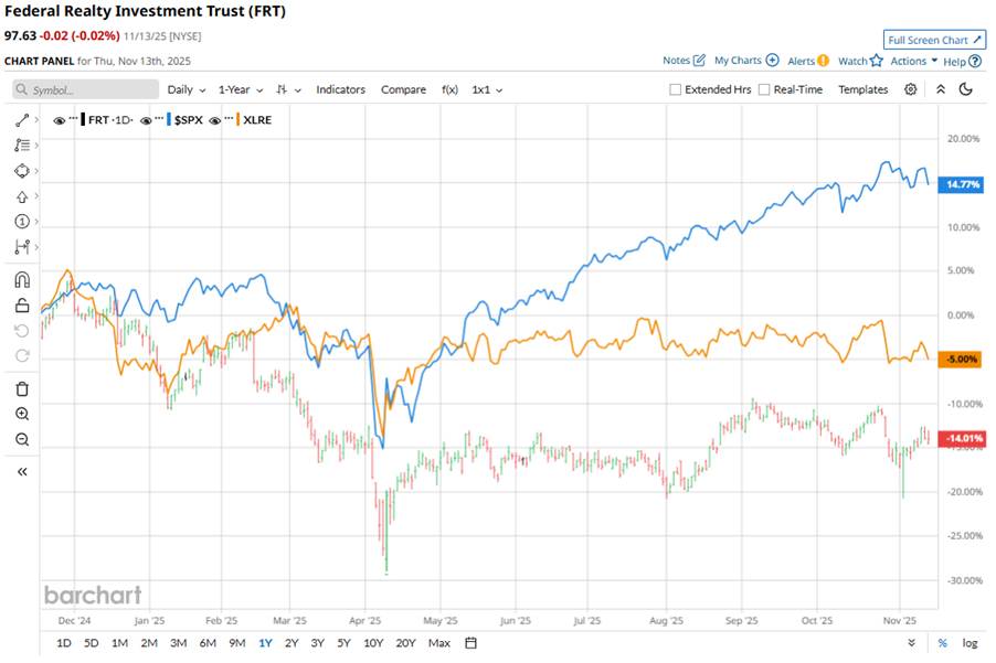 Shares of this retail REIT have underperformed the broader market. Over the past 52 weeks, FRT stock has declined 14.4%, while the broader S&P 500 Index ($SPX) has gained 12.6%. Moreover, on a year-to-date (YTD) basis, the stock is down 12.8%, compared to SPX’s 14.6% rise.