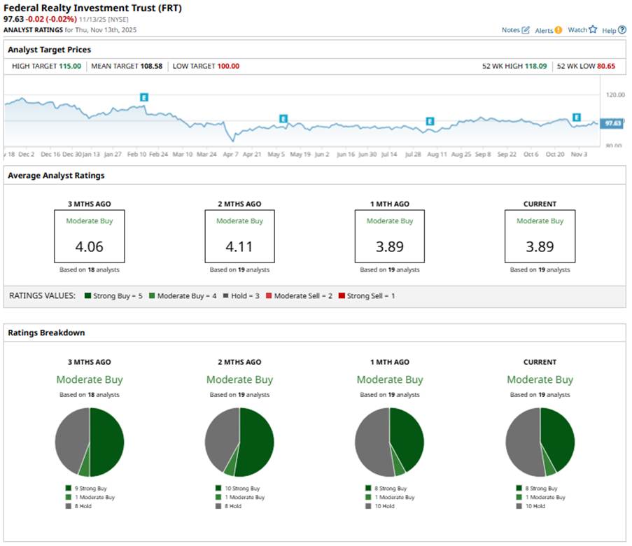 The mean price target of $108.58 represents 11.2% upside potential from FRT’s current price levels, while the Street-high price target of $115 suggests the stock could rise as much as 17.8%.