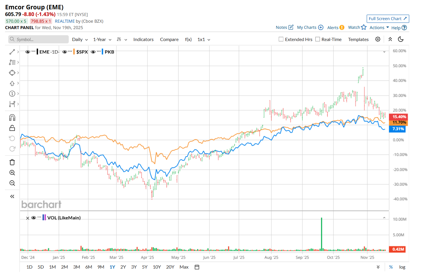 Zooming in further, EME has also outperformed the Invesco Building & Construction ETF’s (PKB8.9% uptick over the past 52 weeks and 20.8% YTD rise.