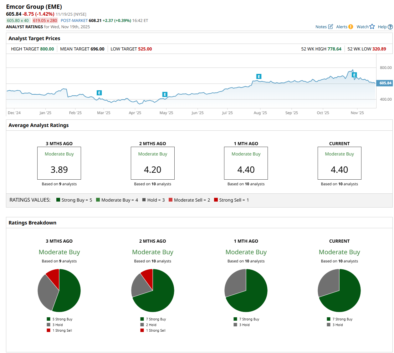 On Oct. 31, Stifel Financial Corp. (SF) maintained a "Buy" rating on EME, but lowered its price target to $713, indicating a 17.7% potential upside from the current levels.