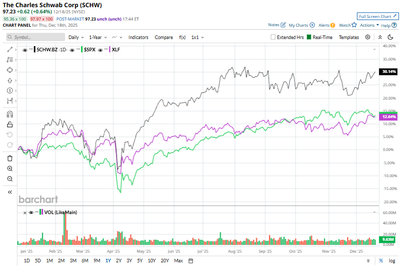 SCHW stock has climbed 31.5% over the past year, outperforming the S&P 500 Index’s ($SPX) 15.4% gains and the Financial Select Sector SPDR Fund’s (XLF) 14.5% gains over the same time frame.