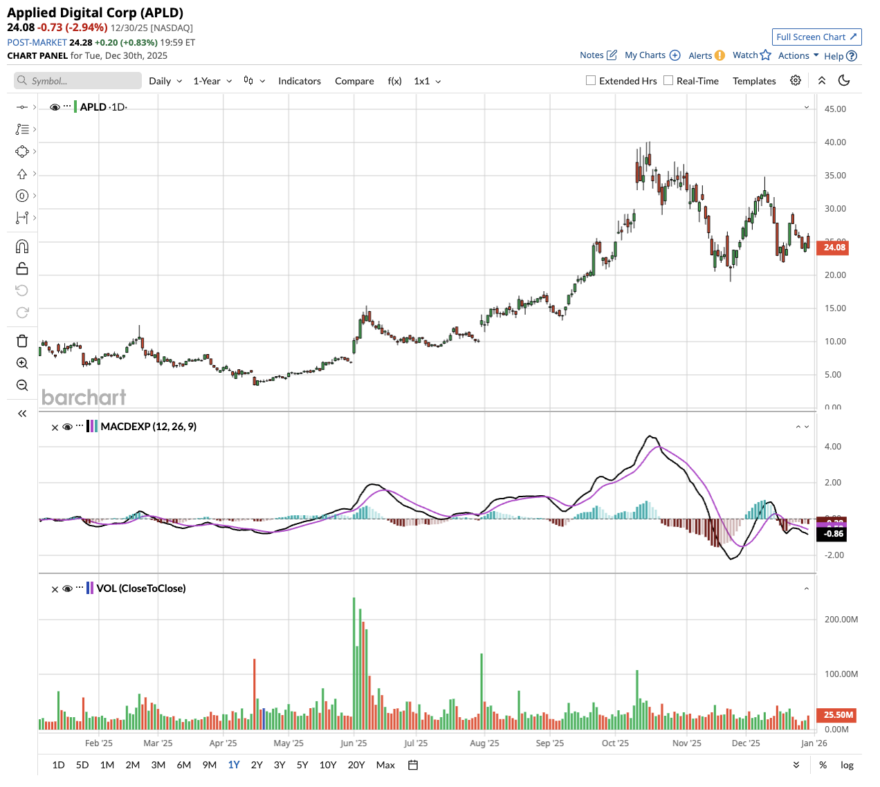 Valued at a market cap of $6.88 billion, Applied Digital's stock has more than tripled in the past 12 months. Despite these outsized gains, APLD stock is down almost 40% from its 52-week high.