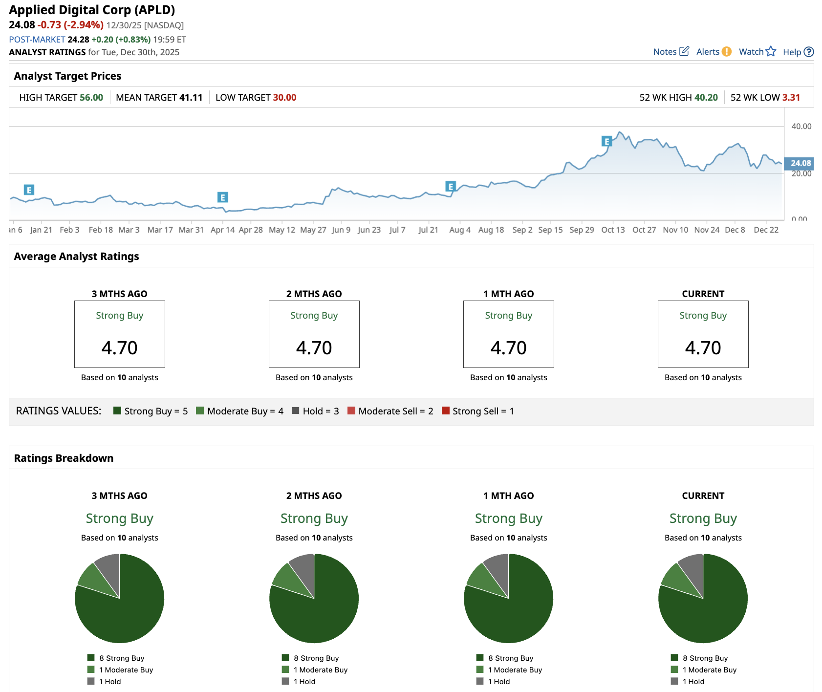 Out of the 10 analysts covering APLD stock, eight recommend “Strong Buy,” one recommends “Moderate Buy,” and one recommends “Hold.” The average APLD stock price target is $41.11, indicating an upside potential of 60% from current levels.