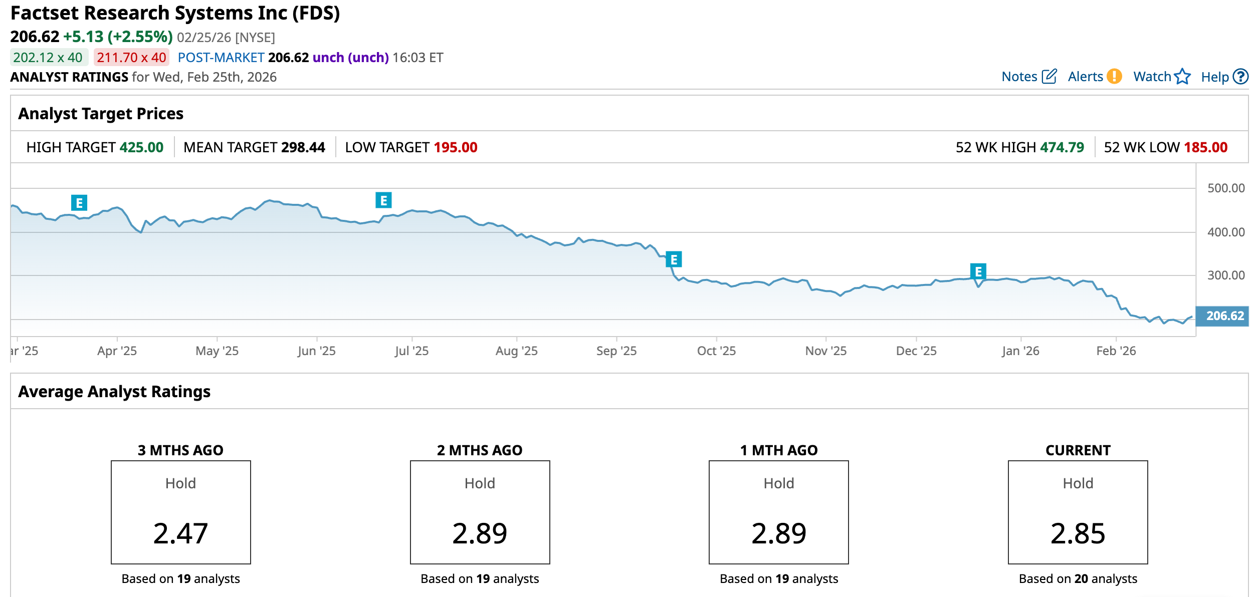 The S&P 500 Index ($SPX) surged about 16.67% in 2025 and has inched higher again this year by 1.5%. While the broader market has pushed to new gains, FactSet has been stuck in reverse, underscoring the degree of caution investors hold about its growth trajectory in an AI-driven world. In fact, after climbing to a year-to-date (YTD) high of $300.63 on Jan. 12, FactSet’s stock has since tumbled roughly 31.3% from that peak.