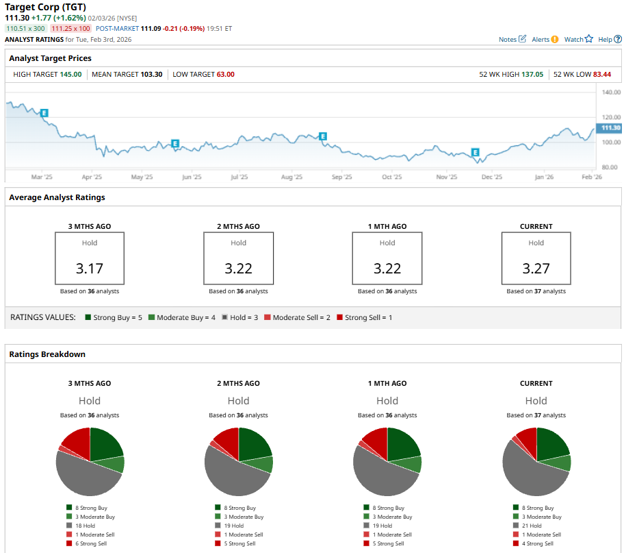 On Feb. 3, Evercore ISI Group analyst Greg Melich raised its price target on Target from $95 to $100, a 5.26% increase, while maintaining its “In-Line” rating, signaling steady confidence in the stock’s outlook without a change in its overall investment stance.