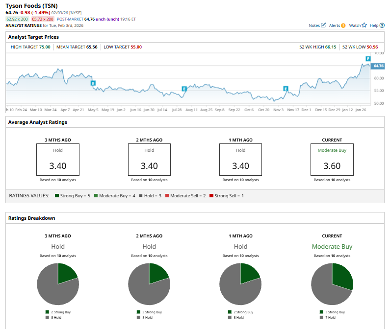 On Feb. 3, Andrew Strelzik of BMO Capital Markets reaffirmed his “Outperform” rating on Tyson Foods and raised his price target from $67 to $73, an increase of about 9%, signaling continued confidence in the company’s growth prospects and future performance.