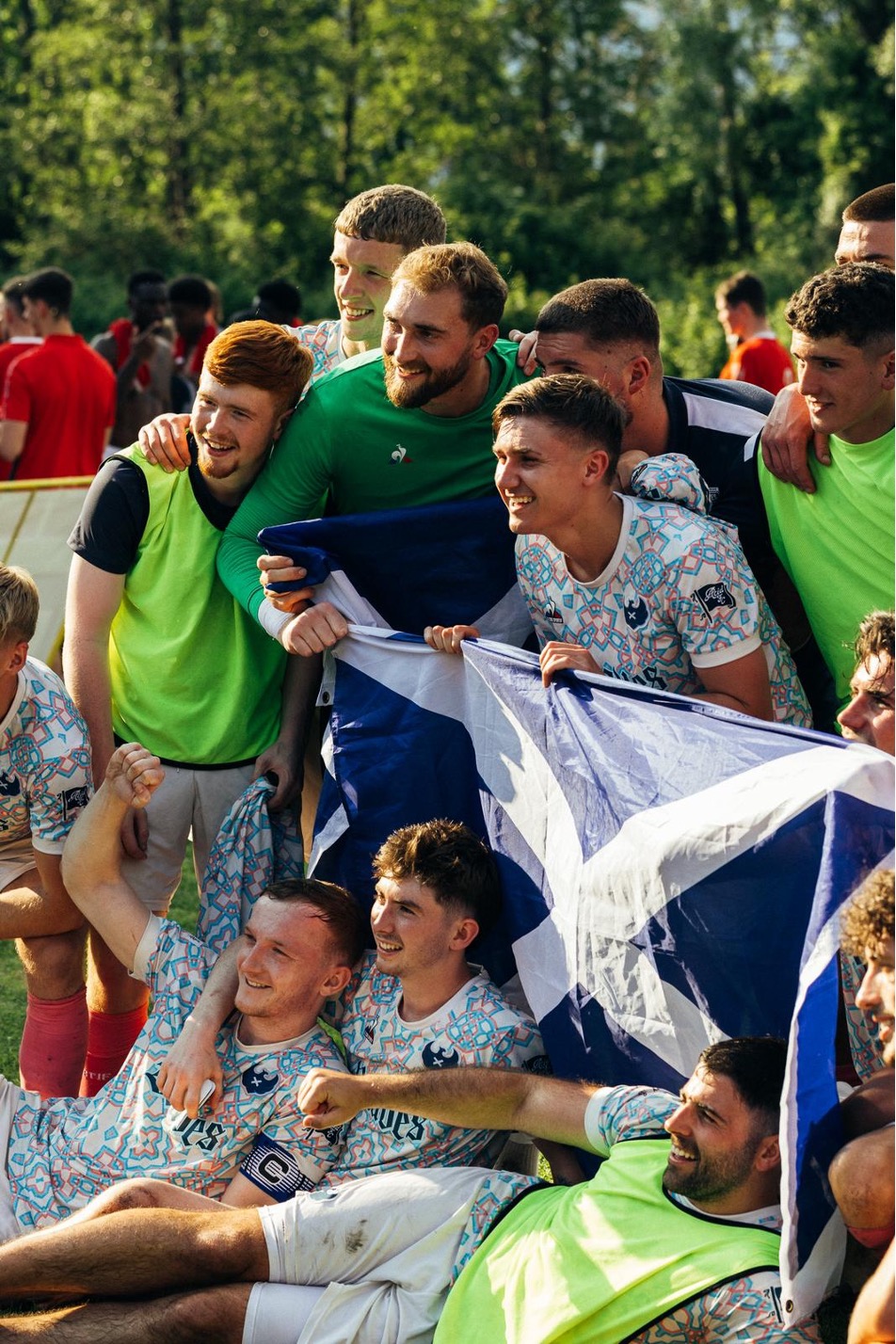 Victorious Caledonian Braves celebrate Scotland and the team’s win in the FENIX Trophy Championship match over FC United of Manchester earlier this month in Lake Iseo, Italy