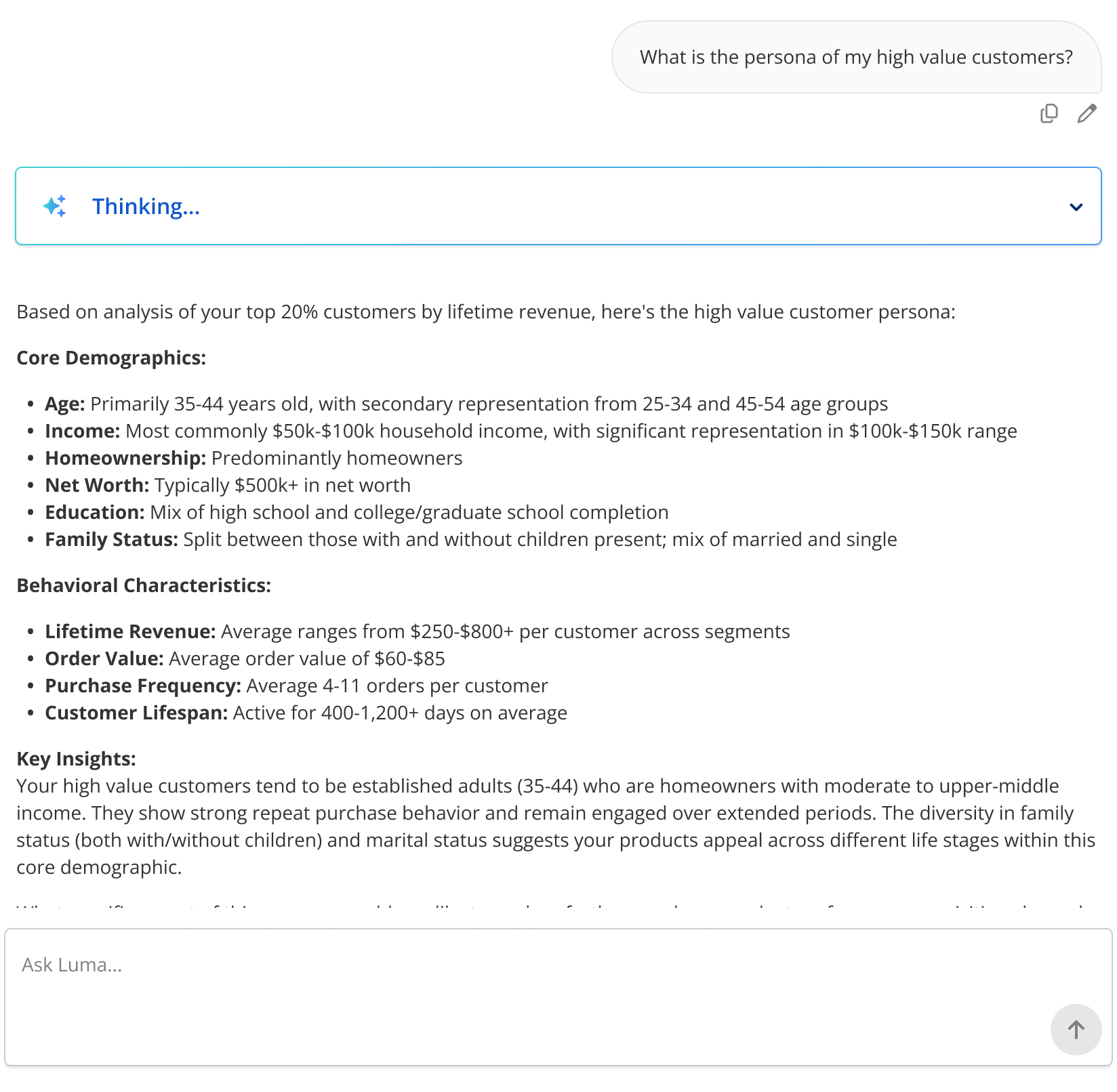 As AI extends deeper into ecommerce, marketers are increasingly challenged not only by the volume of data available but by the growing number of disparate tools and integrations they’re expected to manage. Across reporting platforms, analytics dashboards, apps, and advertising channels, performance insights are often fragmented and don’t allow flexibility for unique brand definitions. Luma, built directly into the Decile platform, solves this by consolidating data into one place. It sits at the intersection of a CDP, an analytics engine, and a built-in AI analyst - creating a unified environment where teams can move from data to decisions in one step. Luma brings clarity and direction to even the most complex multi-step questions, empowering ecommerce operators to make informed, efficient, and confident decisions at scale.