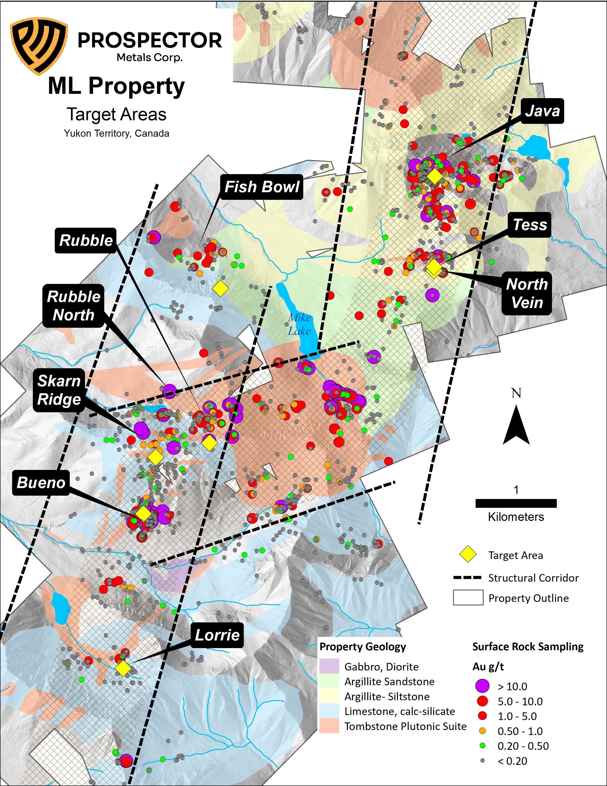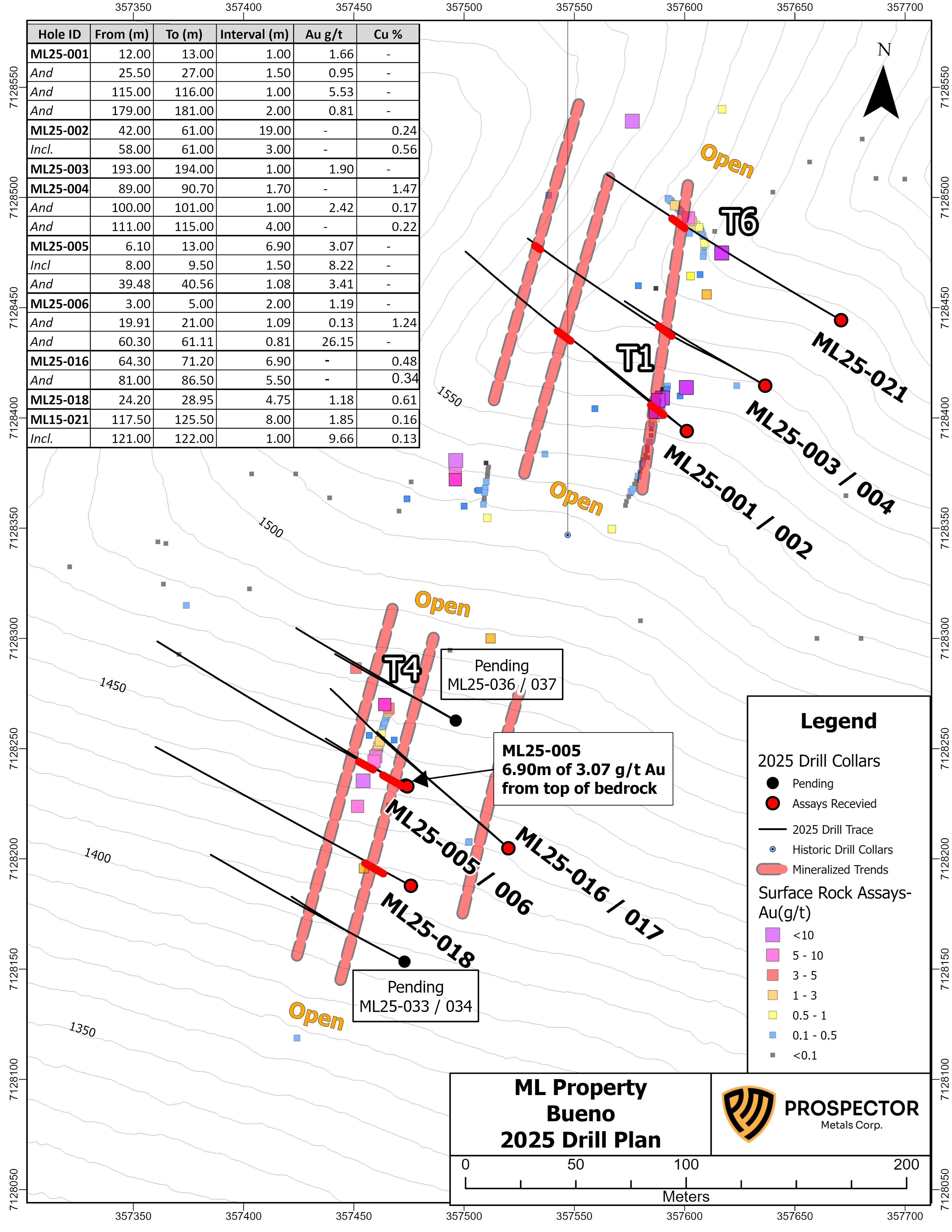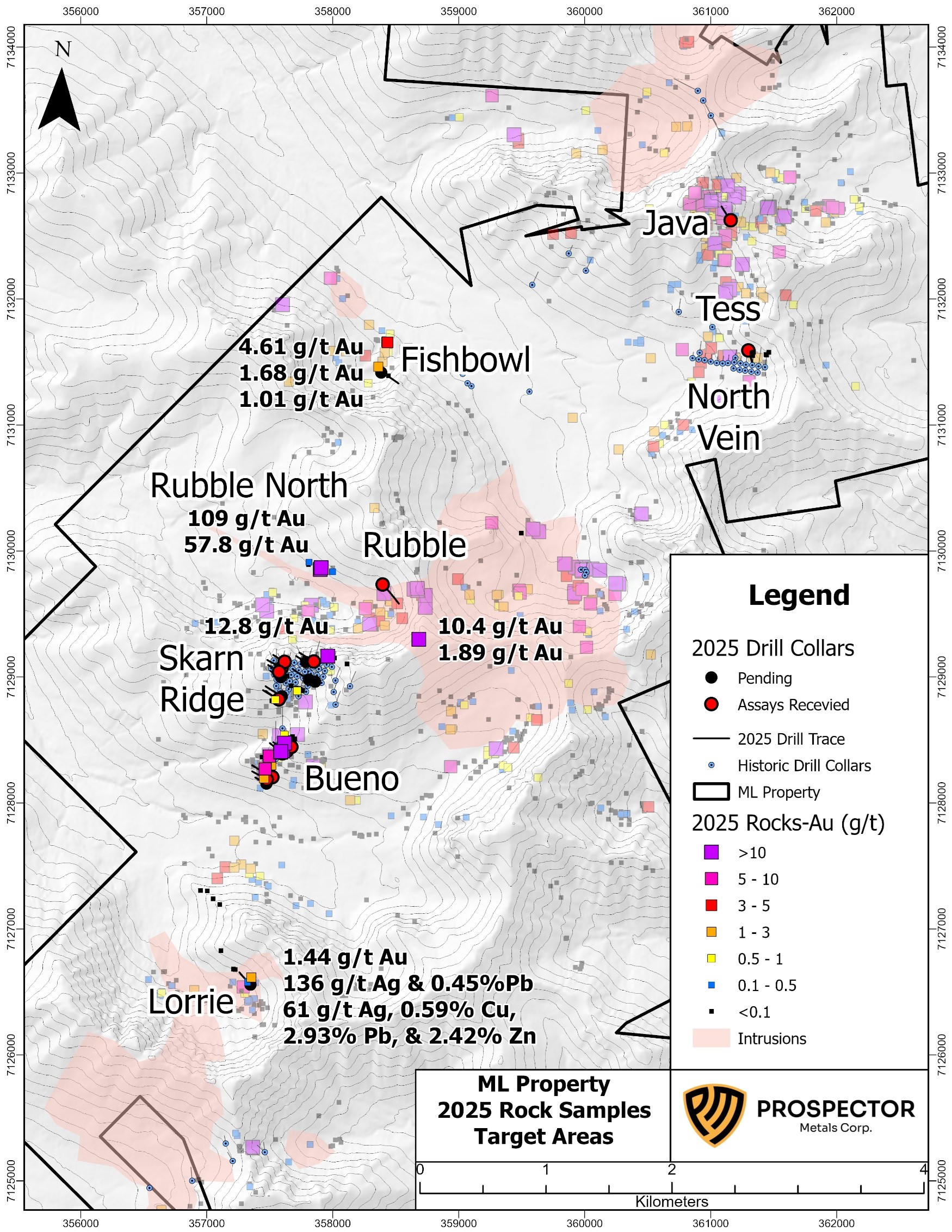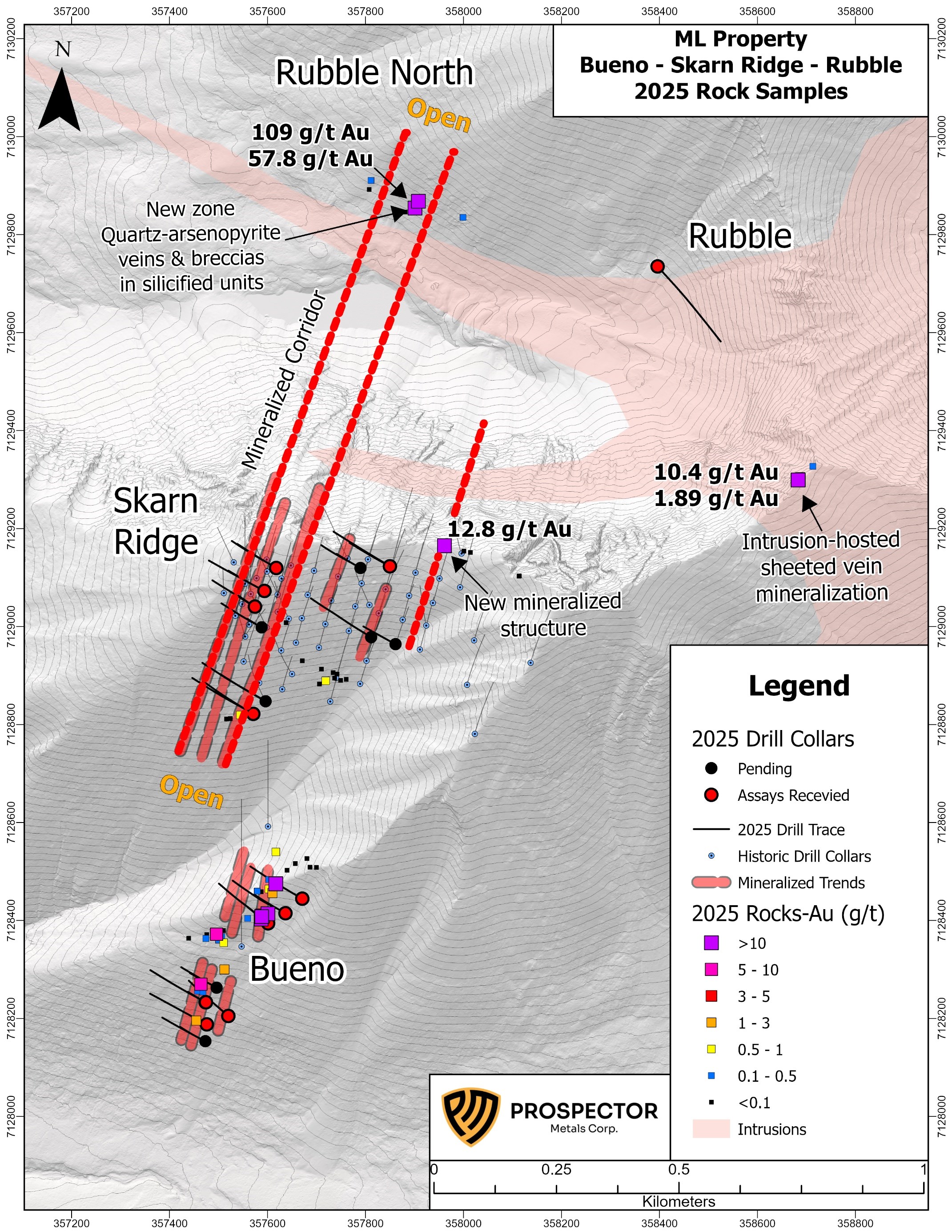 Vancouver, British Columbia--(Newsfile Corp. - October 20, 2025) - Prospector Metals Corp. (TSXV: PPP) (OTCQB: PMCOF) (FSE: 1ET) ("Prospector" or the "Company") today announced final assay results for 12 drill holes from the Skarn Ridge - Bueno Trend (ML25-12 to 23). The Skarn Ridge - Bueno Corridor can now be traced in drilling for at least 1.4 kilometres and new mapping and prospecting results suggest it extends at least 2.0 kilometres. Skarn Ridge is located 4 kilometres to the southwest of the recently discovered TESS Zone. This 4km gap has yielded some high grade gold surface samples in limited work to date (Figure 1) but remains largely unexplored.