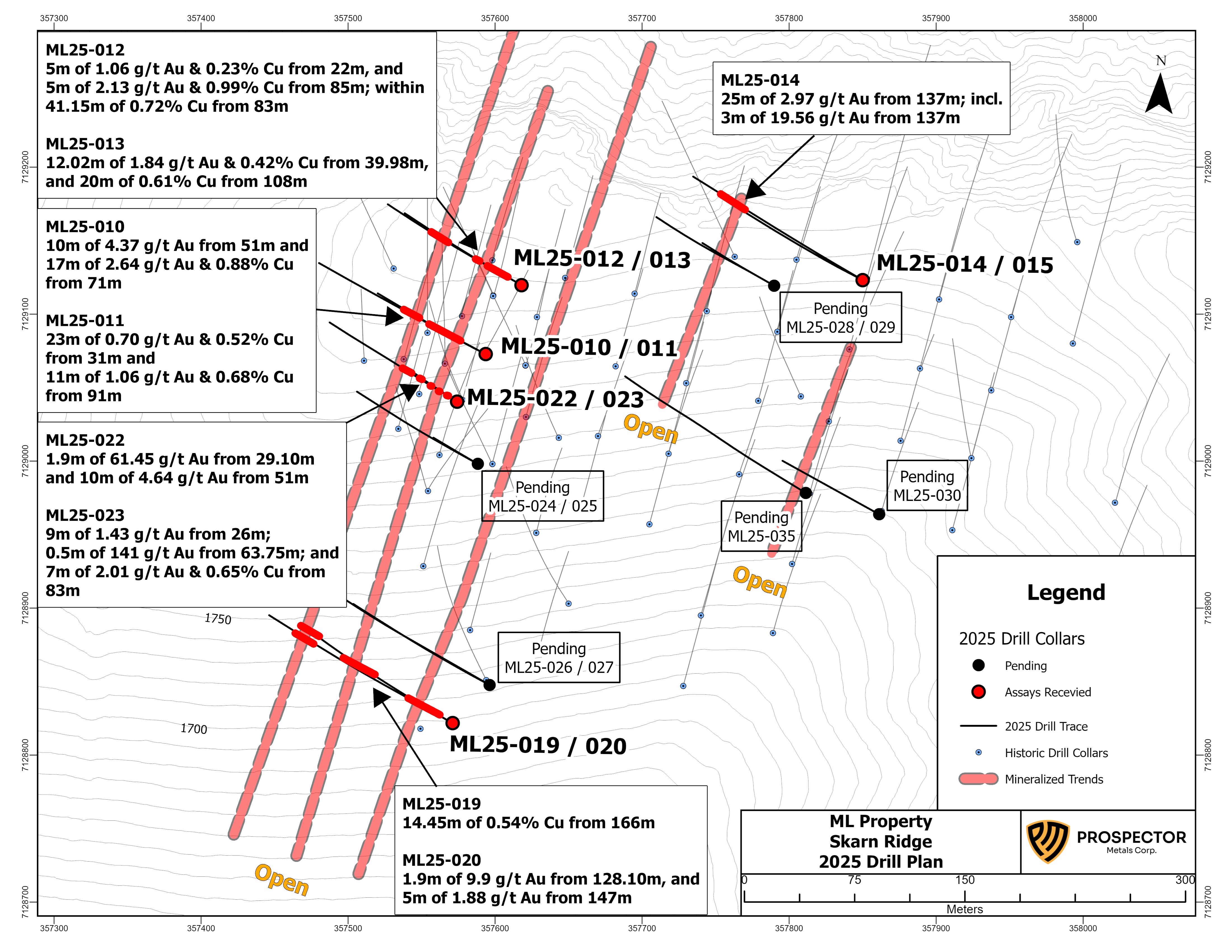 A total of 2,976.84m over 18 drill holes were completed on the Skarn Ridge target. To date, results have been received for ten holes; including previously announced results on ML25-10 & -011(1). The holes were designed to test previously unrecognized north-northeast trending structural controls associated with historically reported gold-copper mineralization on the target (Figure 1).