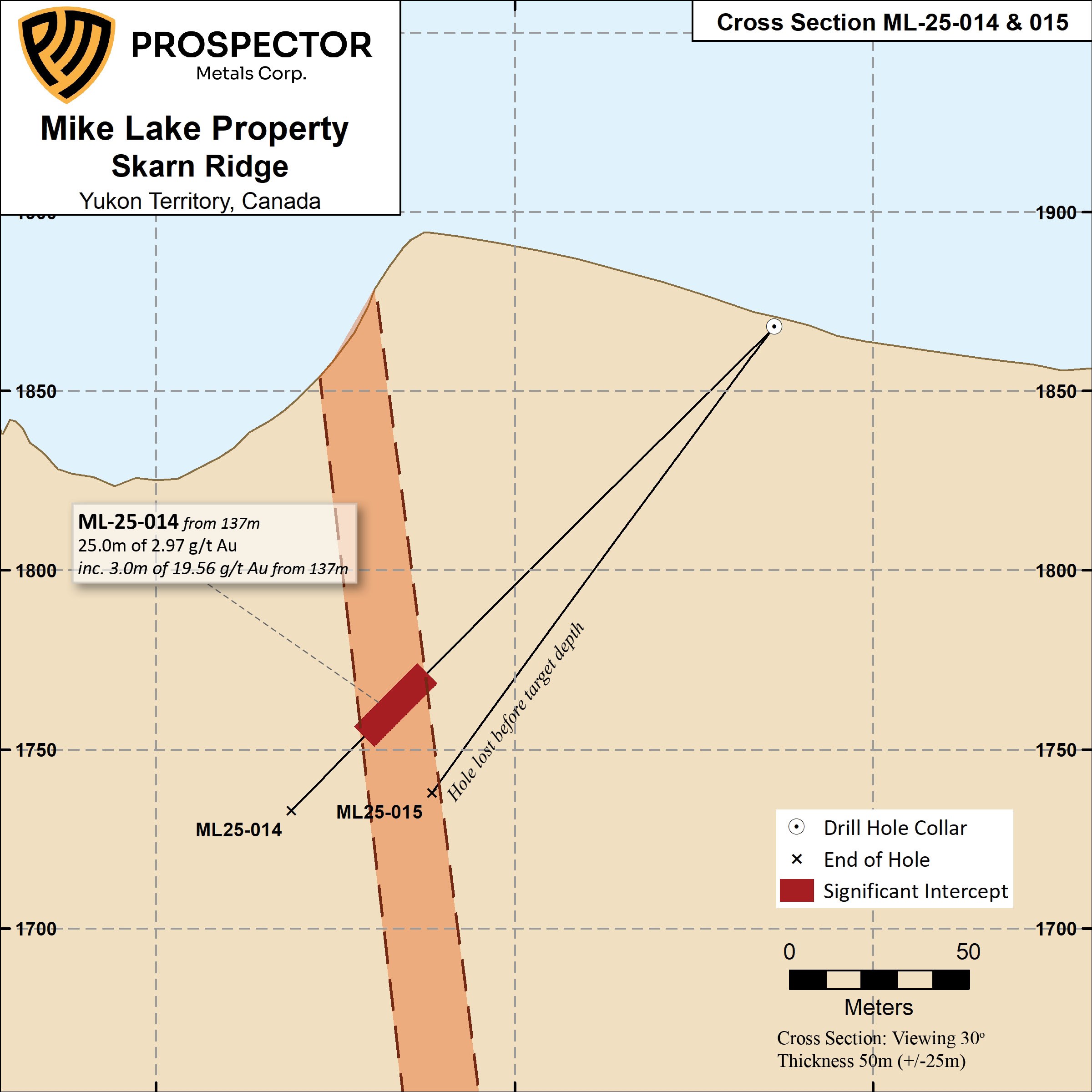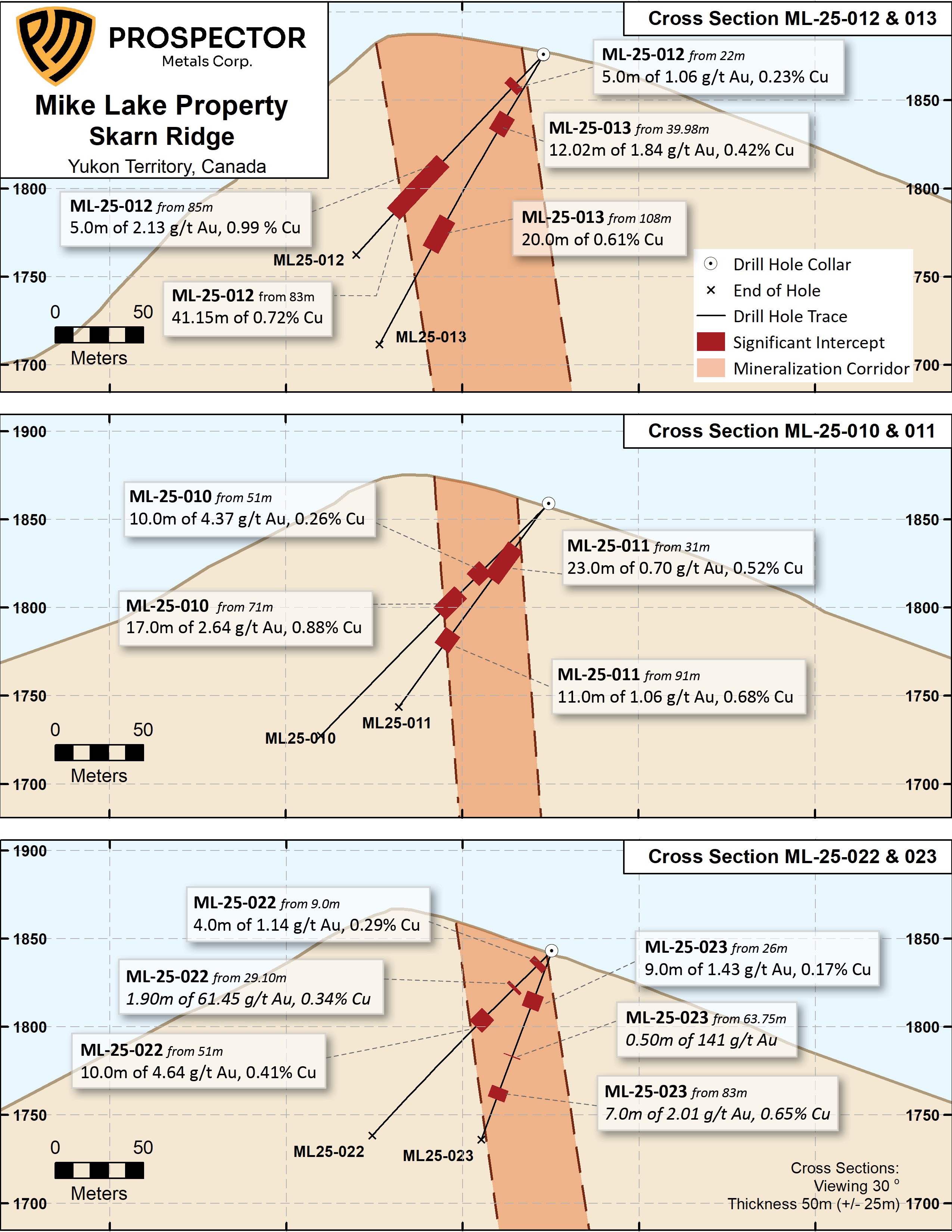 Rob Carpenter, Ph.D., PGeo., President, CEO and Co-Chairman of Prospector, stated: "Skarn Ridge represents a wide structural corridor hosting multiple, parallel trending gold zones which are dipping near vertical. These zones are open along trend and at depth. Skarn Ridge is a distinct zone from our newly discovered TESS Zone, separated by a 4-kilometre gap that will be further evaluated in our next phase of exploration. Our maiden drill program in 2025 has successfully identified numerous high-grade gold trends across the claim block suggesting the presence of a district-scale mineralizing system."