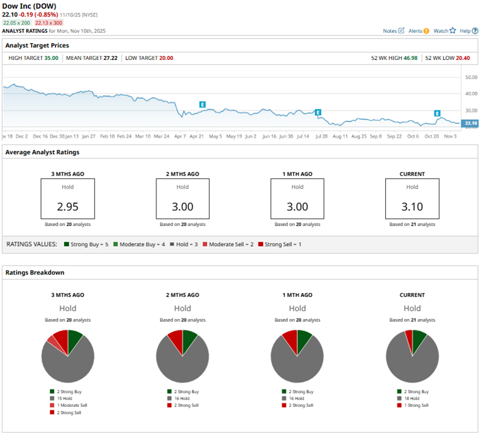 The mean price target of $27.22 represents a 23.2% premium to DOW’s current price levels. The Street-high price target of $35 suggests a 58.4% potential upside.