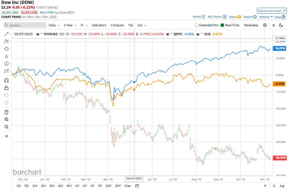 Despite reporting weaker-than-expected Q3 2025 revenue of $9.97 billion, Dow’s shares jumped nearly 13% on Oct. 23 as its adjusted loss of $0.19 per share was significantly smaller than the expected loss. Investors cheered the company’s strong cost discipline, having achieved over half of its planned $6.5 billion in near-term cash support, including $1 billion in capital spending cuts and accelerated cost reductions. Additionally, higher volumes from new U.S. Gulf Coast polyethylene and alkoxylation assets lifted margins.