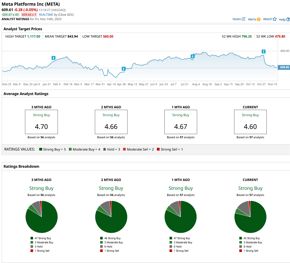 Out of the 57 analysts covering META stock, 45 recommend “Strong Buy,” three recommend “Moderate Buy,” eight recommend “Hold,” and one recommends “Strong Sell.” The average META stock price target is $843.94, indicating a potential upside of almost 40%.