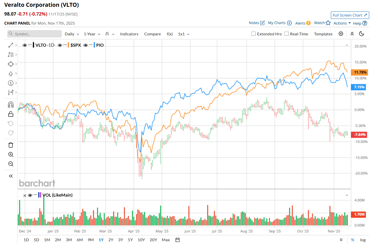 Narrowing the focus, VLTO has also lagged behind the Invesco Global Water ETF’s (PIO8.8% rise over the past 52 weeks and 13.2% YTD return.