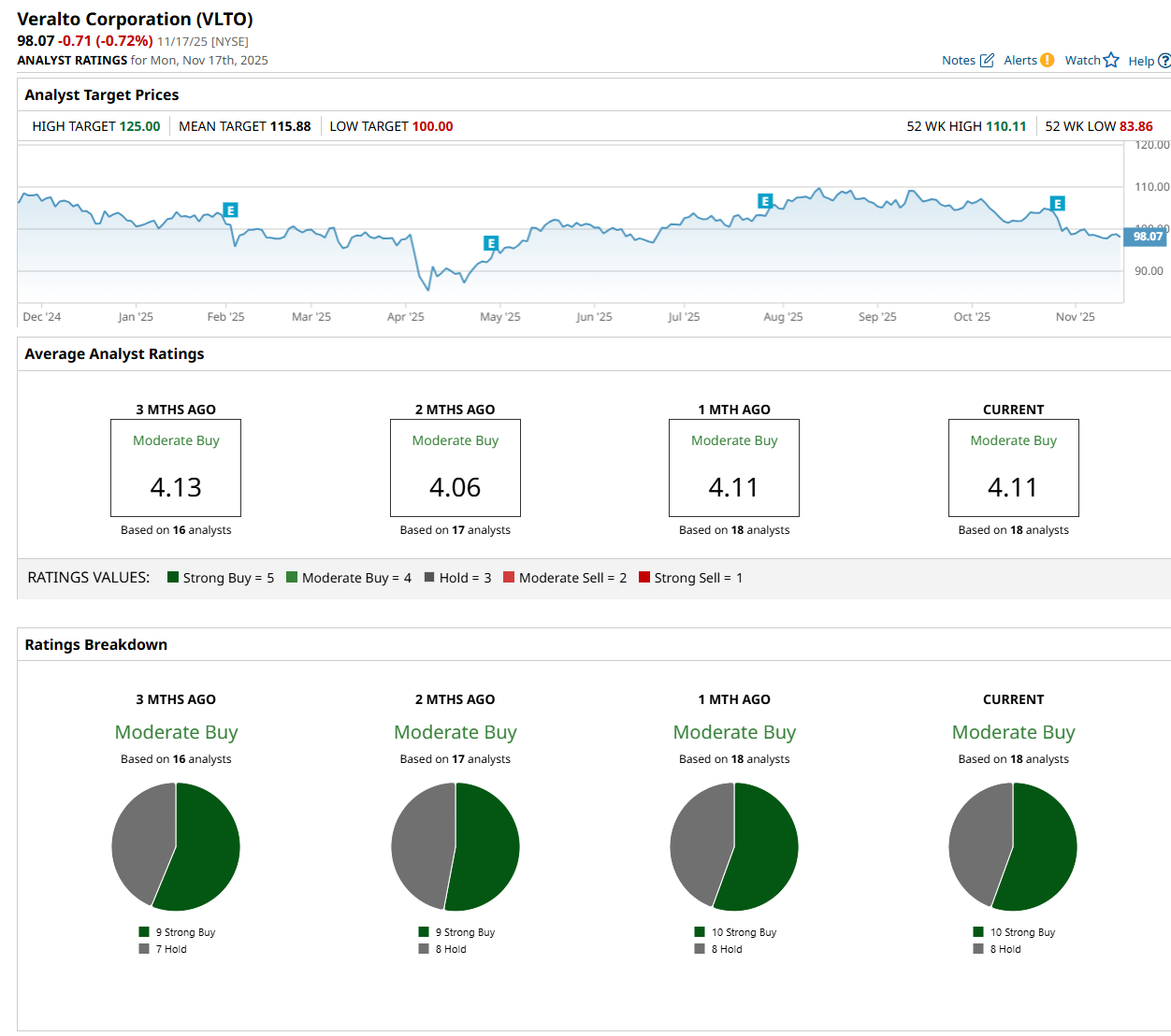 On Nov. 5, UBS Group AG (UBS) maintained a "Neutral" rating on VLTO and raised its price target to $112, indicating a 14.2% potential upside from the current levels.