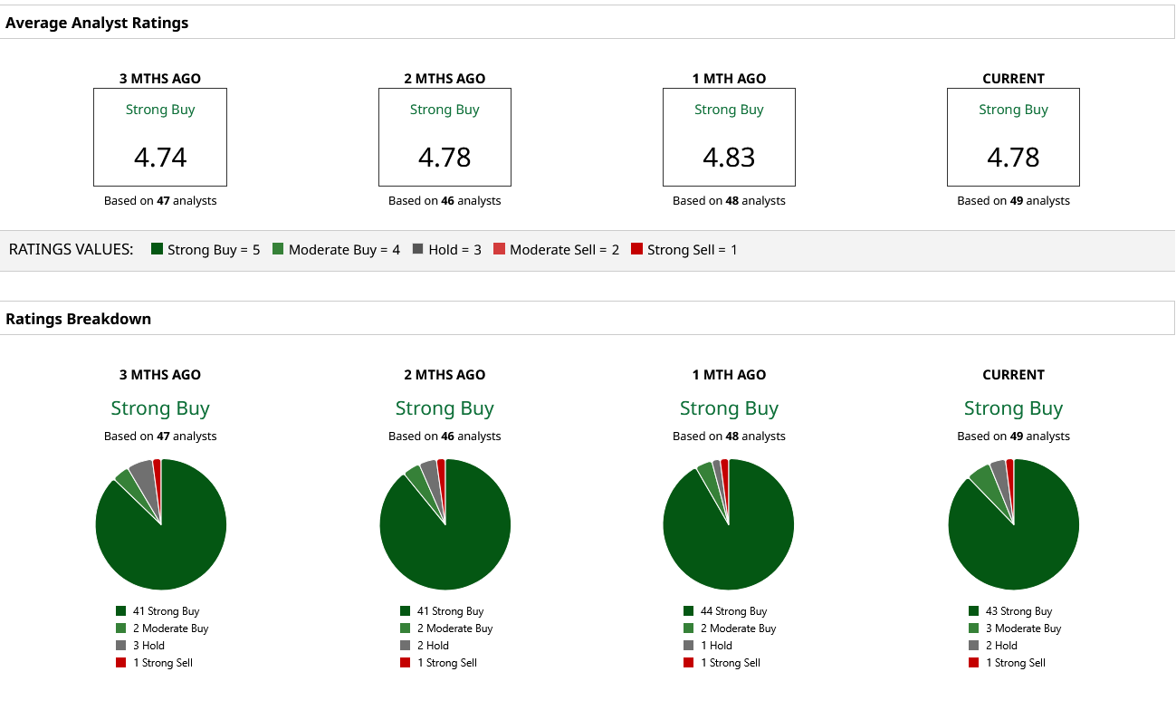Thus, analysts have attributed a rating of “Strong Buy” for the NVDA stock, with a mean target price of $255.07. This denotes an upside potential of about 36% from current levels. Out of 49 analysts covering the stock, 43 have a “Strong Buy” rating, three have a “Moderate Buy” rating, two have a “Hold” rating, and one has a “Strong Sell” rating.