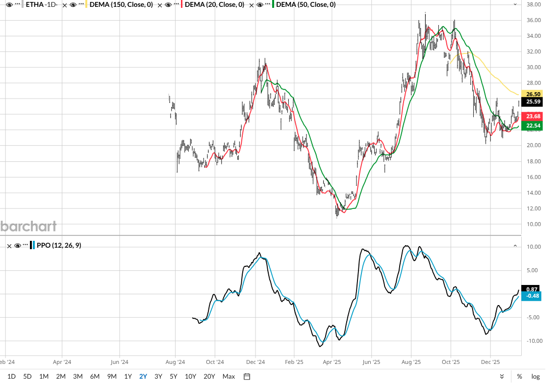 Now, the dust is settling. And that produces a potentially powerful trading move for ETHA. It’s up 14% year to date, and looking for more. While outperforming IBIT.