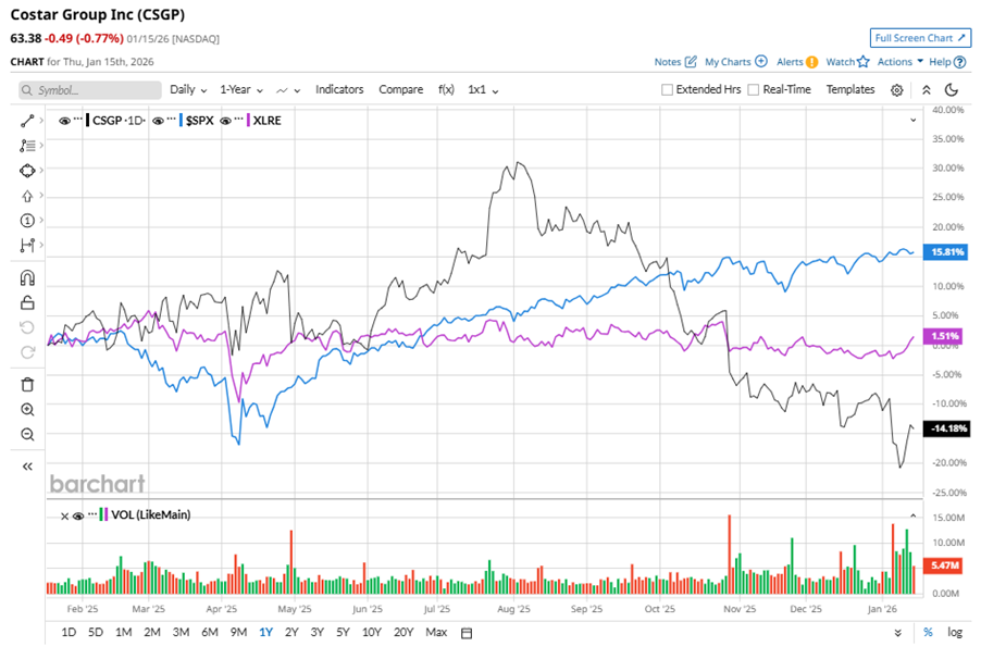 CSGP stock has underperformed the S&P 500 Index’s ($SPX) 16.7% gains over the past 52 weeks, with shares down 13.4% during this period. Similarly, it underperformed the Real Estate Select Sector SPDR Fund’s (XLRE) 3.8% gains over the same time frame.