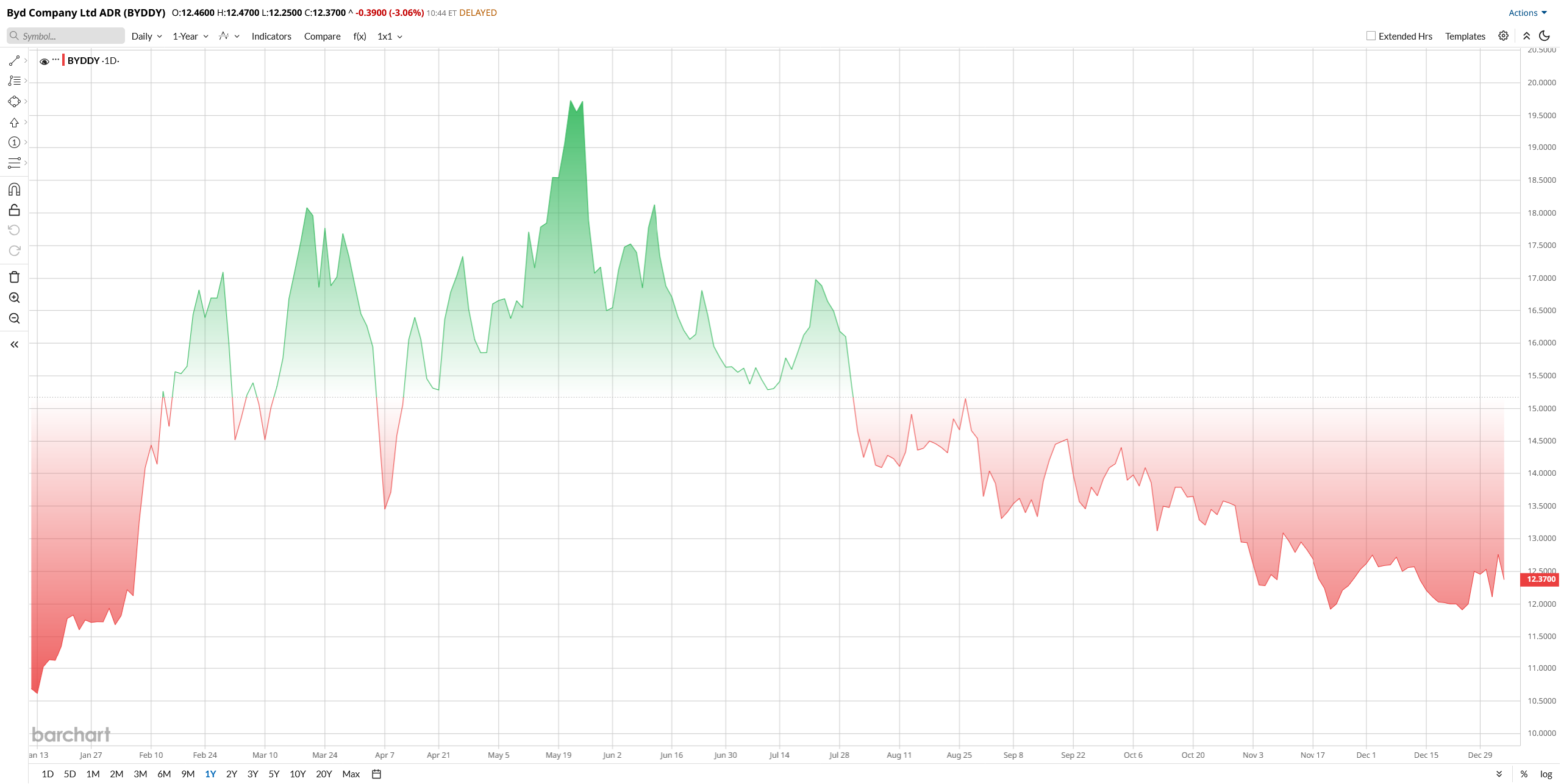 Wall Street remains broadly bullish on BYD stock. Barchart shows a “Moderate Buy” consensus among analysts on BYD, with an average 12-month target of $20, implying around 57% upside potential.