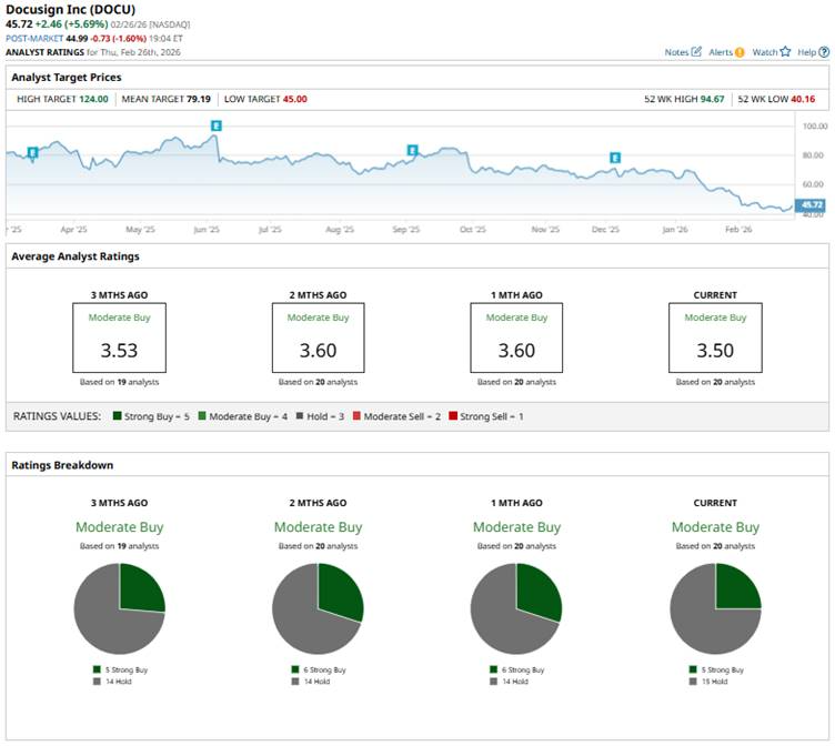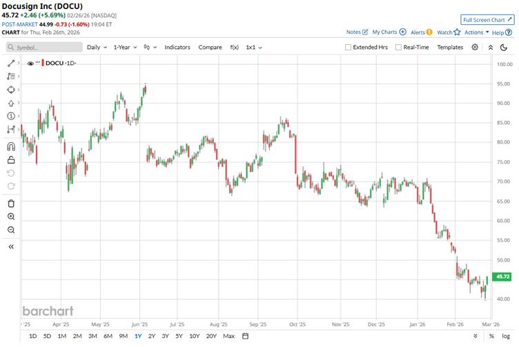 DocuSign’s share price has experienced significant weakness over the past year and into 2026, reflecting both company-specific execution challenges and broader sell-offs in software stocks. Over the past 52 weeks, DOCU has fallen sharply by 52% from its highs of around $94.67, reached in June 2025. The stock is down 44.25% over the past year.