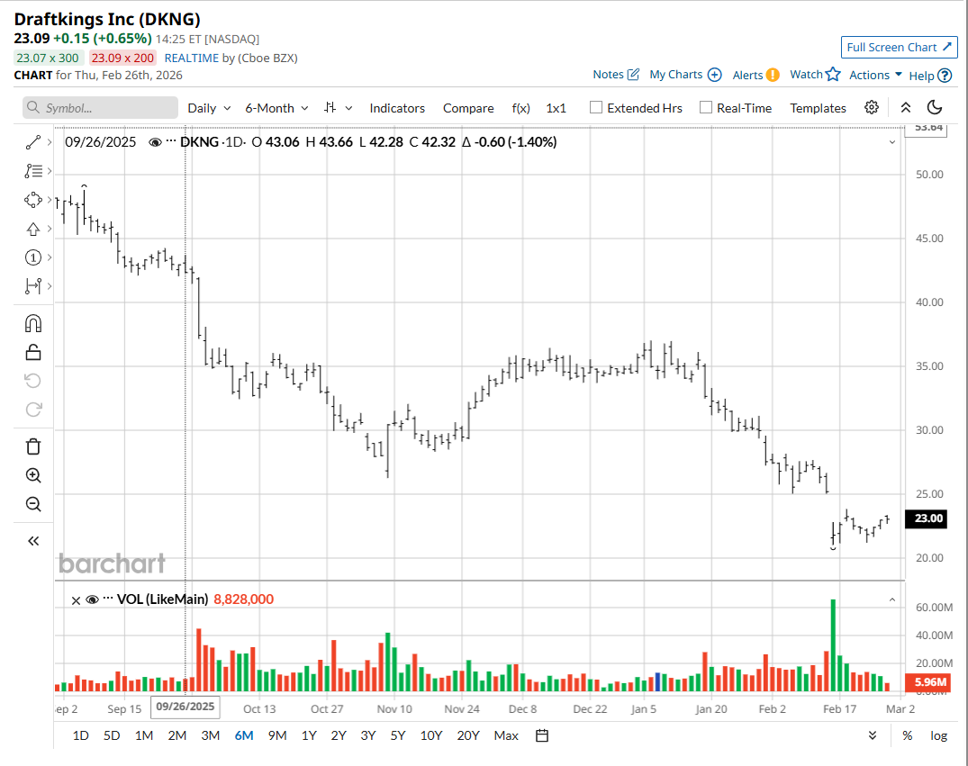 This transaction is significant in the context of the current share price. DraftKings is trading near its 52-week lows, but that’s not all. DKNG stock has lost 50% of its value in the last six months and is down 31% so far this year. If ever investors needed some reassurance regarding the company’s prospects, Sloan just provided it. Having said that, management will need to do more to reassure investors about DraftKing's dismal 2026 outlook and slowing growth.