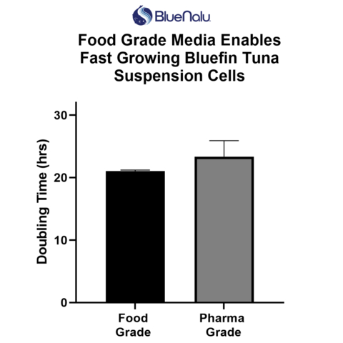 BlueNalu bluefin tuna suspension muscle derived cells were shown in our studies to grow equally fast in food grade and pharmaceutical grade cell culture media. In these studies, doubling times averaged <24 hours in food grade media, showing the potential of these cells for large scale manufacturing. (Graphic: Business Wire)