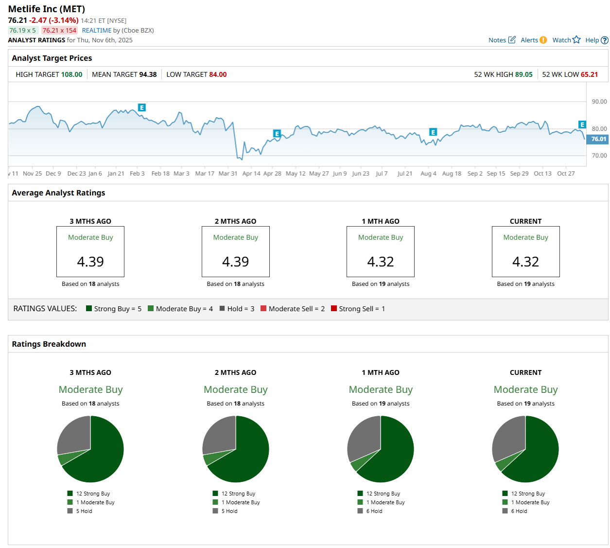 On Nov. 6, UBS Group AG (UBS) analyst Michael Ward CFA maintained a "Buy" rating on MET and set a price target of $95, indicating a 24.7% potential upside from the current levels.
