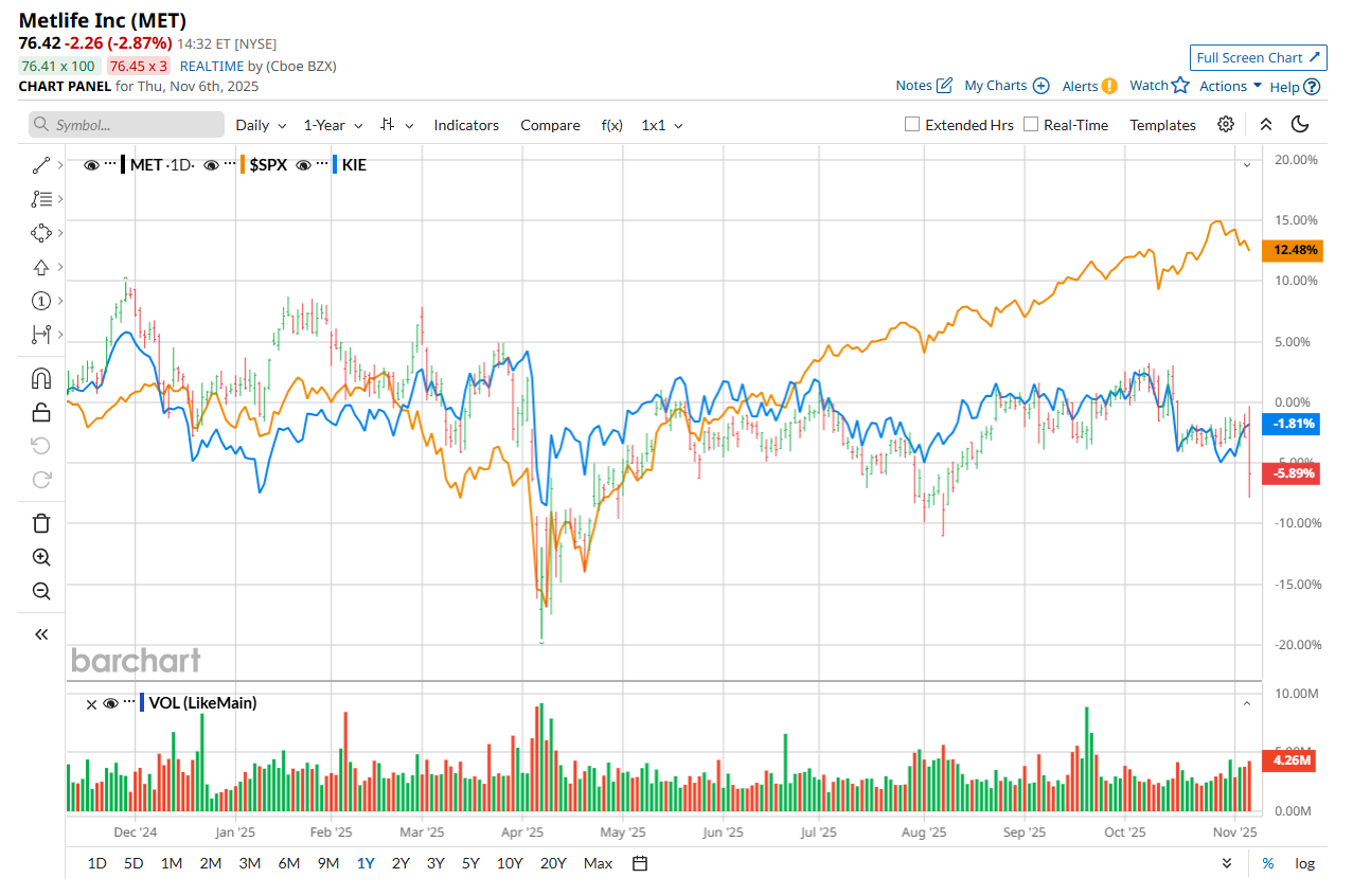 Narrowing the focus, MET has also lagged the SPDR S&P Insurance ETF (KIE), which is down 1.8% over the past 52 weeks and up 1.9% on a YTD basis.