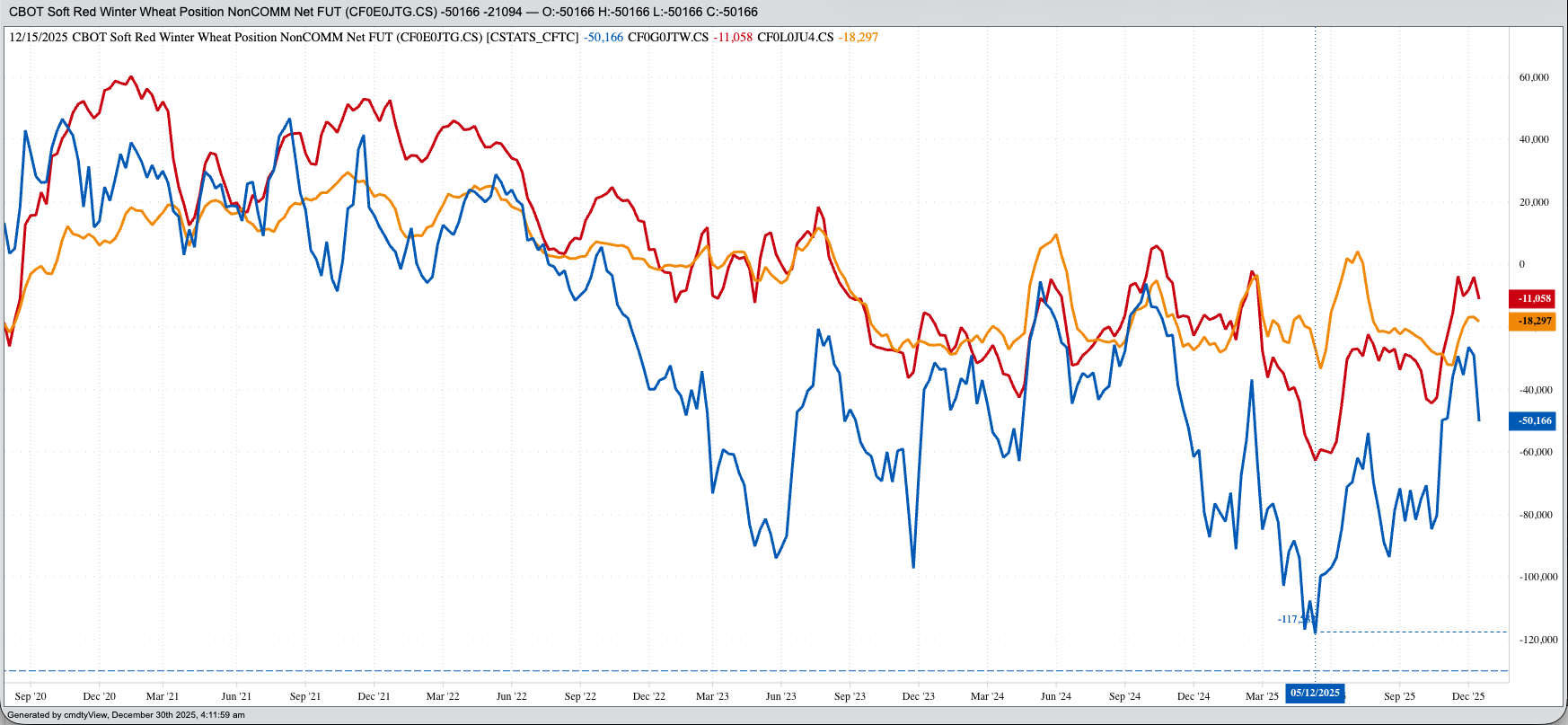 Wheat: Winter wheat markets were fractionally higher to start the day, but I’m expecting a dull, holiday light display (blinking green and red) from this writing through Tuesday morning’s intermission. The March SRW issue was up 0.5 cent at this writing after trading as much as 2.5 cents higher and 1.0 cent lower overnight on trade volume of 3,000 contracts. It was a similar story in HRW where the March issue was showing a 3.0-cent trading range, from up 2.25 cents to down 0.75 cent while registering fewer than 1,200 contracts changing hands and was sitting 0.25 cent lower at this writing. What does this tell us about the day ahead? Nothing. A look back at Monday’s session and we know March SRW closed 6.0 cents lower on what looked to be noncommercial selling while March HRW finished 6.25 cents in the red with the carry in the March-May futures spread at 13.0 cents, its strongest close since October 28 indicating continued commercial pressure. National Cash Indexes came in near $4.5550 ($CSWI) and $4.55 ($CRWI), both falling further below previous 5-year end of December lows of $4.9275 and $4.9775 respectively. Based on the Law of Supply and Demand, we know real winter wheat fundamentals remain bearish.