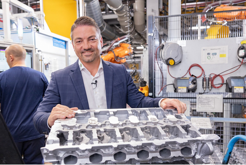 Eric Bader, Managing Director of ExOne, a Desktop Metal Company, stands behind a cylinder head that was produced with the help of a 6-cylinder water jacket core that was binder jet 3D printed on the ExOne Exerial system. (Photo: Business Wire)