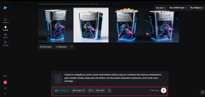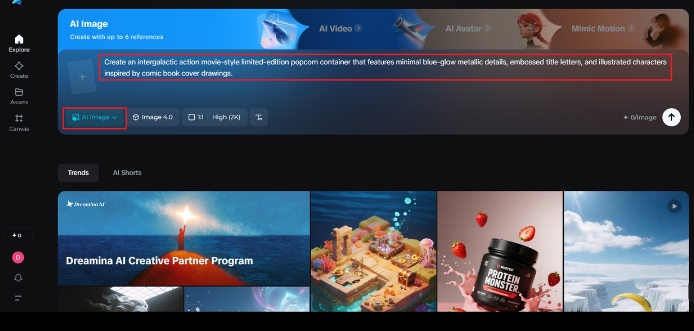 Next, perfect the creative settings, select your model, aspect ratio (for example, cinematic 16 x 9 or square for tease social), and size/resolution (1 K or 2 K for readability on packaging). Then click on the Dreamina icon to generate. The AI generates your idea into a visual storyboard immediately, illustrating how the worlds of entertainment and branding can coexist in one frame.