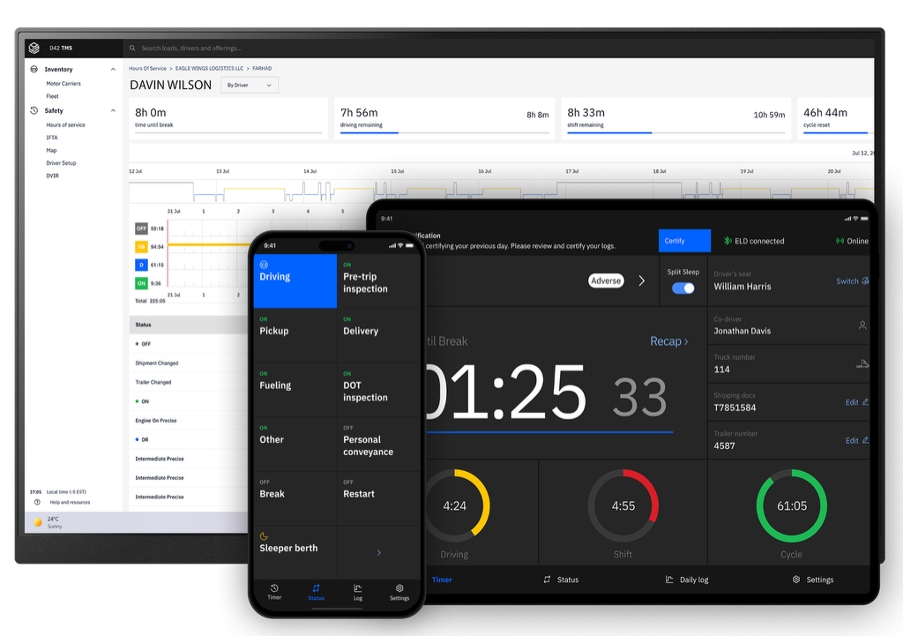 - Compliance ready: DOT Inspection mode, DVIR, IFTA, auto alerts for possible violations.- 24/7 monitoring: ELD runs nonstop, keeping safety and telematics data safe.